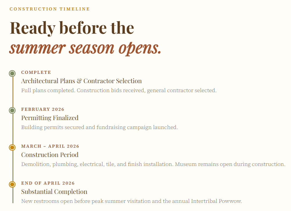 Working from completed architectural plans, we will gut and rebuild the existing restrooms and add a brand-new family restroom — creating facilities that are modern, accessible, and genuinely adequate for our visitor volume. The project is fully designed, contractor selected, and shovel-ready.